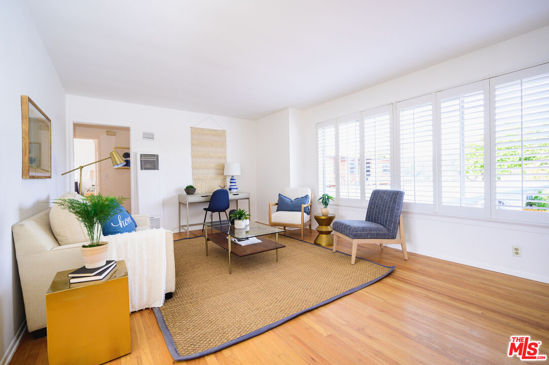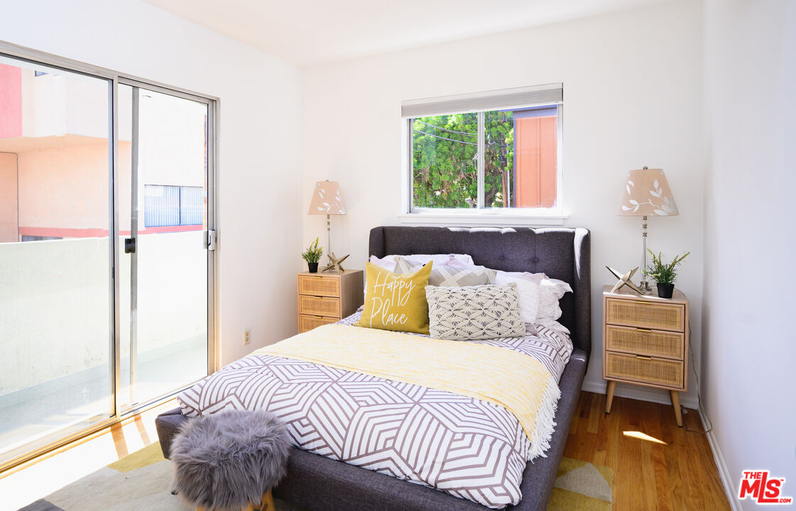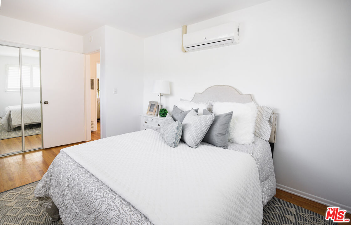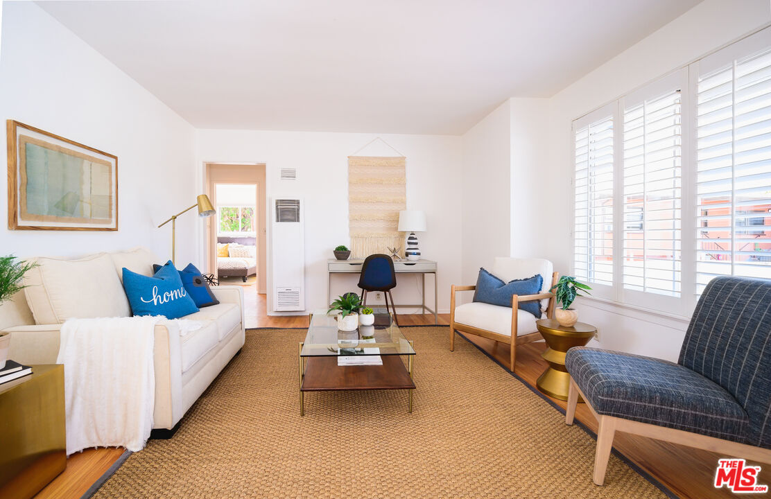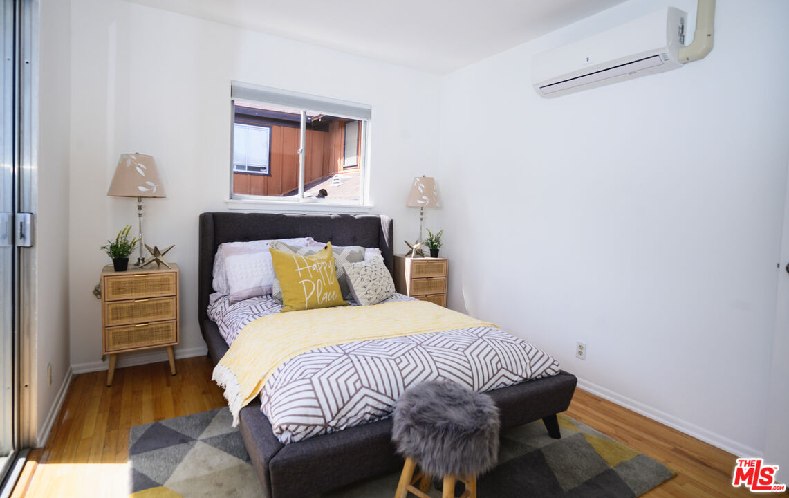 This is what you've been waiting for! Light and bright updated 2bed + 1bath condo in charming, garden style mid-century complex. Spacious 2nd floor unit has only 1 shared wall and is located at the back of the complex. Sun lit living area has hardwood floors, large picture windows with shutters, and mini split AC. Dining area opens to west facing balcony, bringing in tons of natural light. Kitchen features stainless steel appliances, plenty of cabinet space, and a pantry. Updated bathroom with subway tile, new vanity and fixtures. Both bedrooms have large cedar closets, hardwood floors, and mini split AC. Community laundry onsite, 1 car garage parking & EQ insurance. Close to the Metro, Trader Joes, Bristol Farms, Literati Cafe, Bergamont and Amandine.